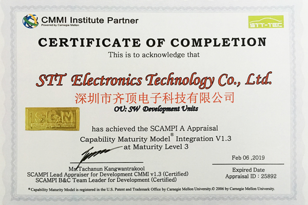 2016年1月份,在齊頂科技CMMI3級認(rèn)證結(jié)果發(fā)布會上,主任評估師宣布:深圳市齊頂電子科技有限公司已經(jīng)達(dá)成了CMMI3級目標(biāo),成功通過CMMI3級認(rèn)證。這是齊頂電子在軟件開發(fā)和管理標(biāo)準(zhǔn)方面發(fā)展的里程碑,標(biāo)志著公司的軟件能力成熟度和項目管理水平與國際主流模式接軌。