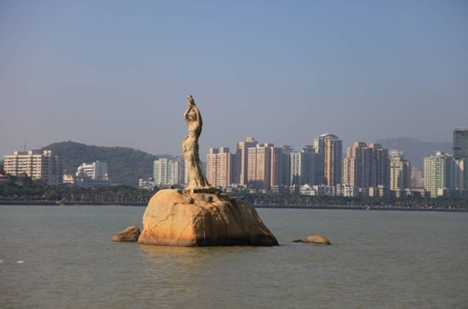 在聆聽導游關于漁女的傳說中,來到了香爐灣畔,親臨觀賞珠海漁女像----她領戴項珠,身掮魚網,褲腳輕挽,雙手高高擎舉著一顆晶瑩璀璨的珍珠,帶著喜悅而又含羞的神情,向世界昭示著光明,親眼目睹使人覺得比傳說更加優(yōu)美,漁女像與情侶路已經成為珠海的象征!